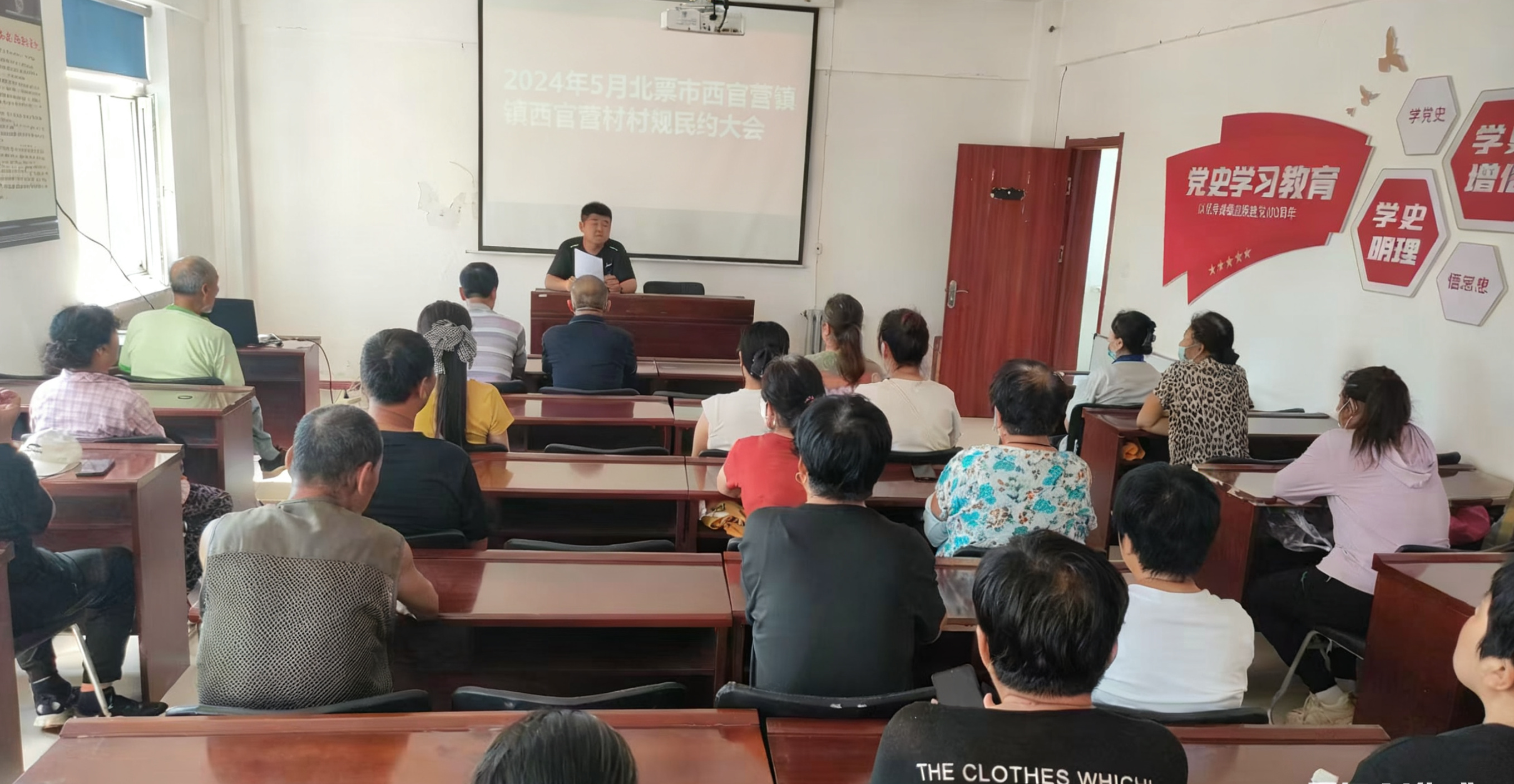 为进一步弘扬社会主义核心价值观,促进文明新风,推动村民积极践行村规民约,开展移风易俗、破除陈规陋习,形成健康文明新风,2025年5月30日,西官营镇西官营村组织开展了“村规民约大会”,村“两委”成员、党员代表、村民代表以及部分村民参加了活动。