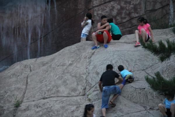 但是,孩子们的好奇心总是让他们急于脱离家长的“掌控”,向更有“挑战性”的地方“冲锋”,于是广场上随处可见各个年龄段的孩子们在陡峭的假山上攀爬、打闹,让周围的人看得心惊胆战。