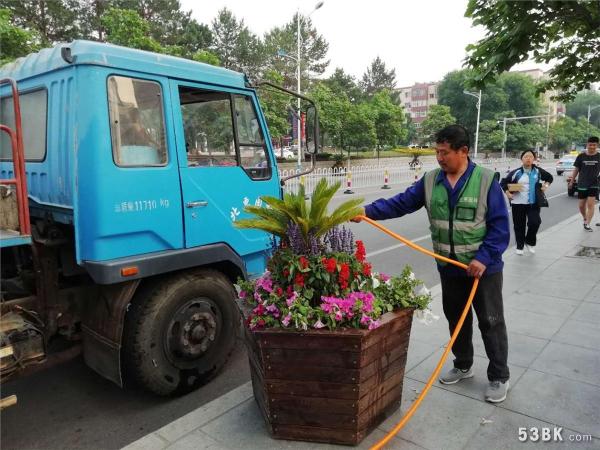 图为工作人员正在给投放好的景观花卉浇水。