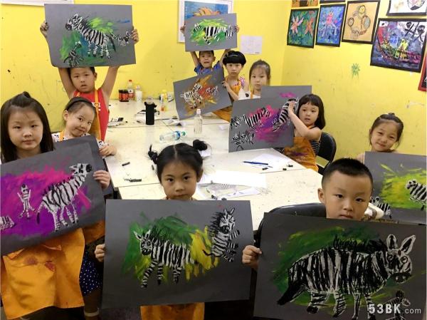 图为绘画机构里的小朋友们正在展示自己的绘画作品。