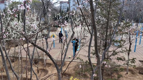 4月8日,清晨6时许,记者来到人民公园,看到许多市民走在公园的甬道上散步健身。在公园门口的停车场,两侧的垂柳抽出新枝吐出绿芽,一排郁郁葱葱的树冠向人们展示着复苏的生机。记者迈步向山顶走去,看到甬道旁的健身场早已被年长的叔叔阿姨“占领”了,他们有的练习引体向上、有的练习臂力、有的练起三位扭腰器……一边健身一边聊天;青壮年跑步的居多,一个个轻盈的身躯从记者身旁跃过,有的市民腰间束着小型外放音箱,跟着音乐节奏慢跑,让晨跑的路途充满了跳动的音符。散步途中路旁的桃花散发着花香,沁人心脾。灌木丛中的连翘十分耀眼,黄色的花朵与桃花的粉白遥相呼应,引来市民驻足观赏,不少市民用相机或手机留住这美丽的春色。