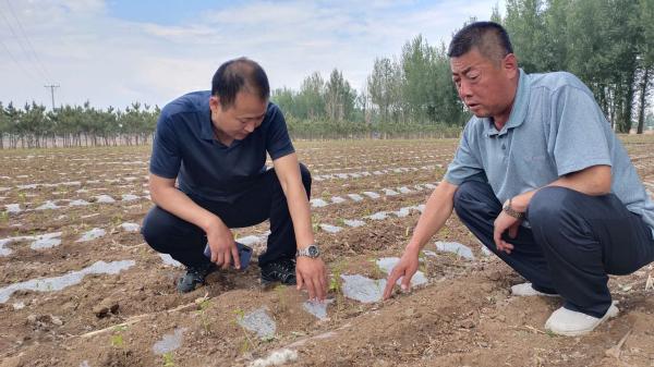 武云东(左)在田间查看辣椒生长情况。