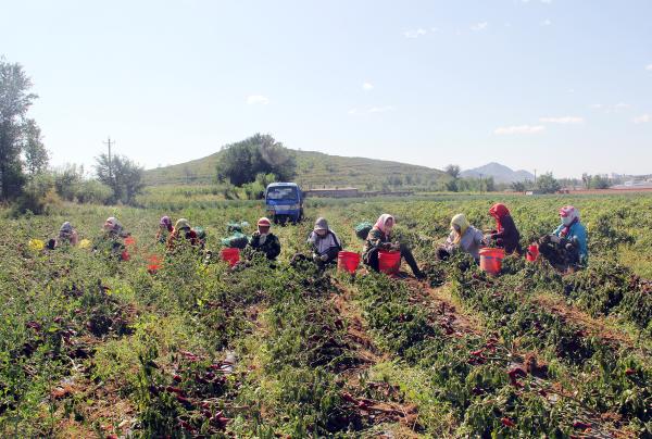 日前,在台吉镇哈只海沟村村民岳中华的辣椒田里,人们正在采摘辣椒。红彤彤的辣椒铺满一地,催生了红灿灿的日子。