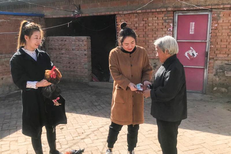驻村书记徐郸(中)、村委会副主任于莉(左)到建档立卡户张桂云家上门收购土鸡。