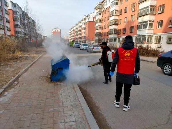1月12日,记者在城关街道看到,多名“红马夹”手持消杀器材穿梭在新苑社区与北煤社区之间,对社区内垃圾点进行消杀作业。