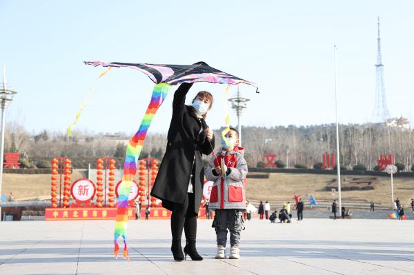 世界广场上正在放风筝的母子。