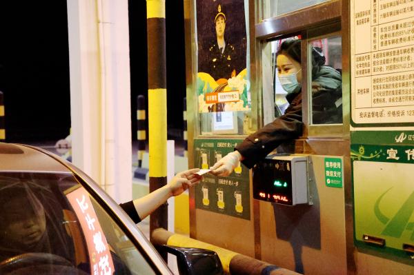 元宵夜,高速收费站坚守岗位的收费员。