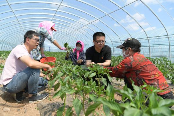 高红岩(右二)在马友营乡巴思营村冷棚小区了解辣椒育种情况。