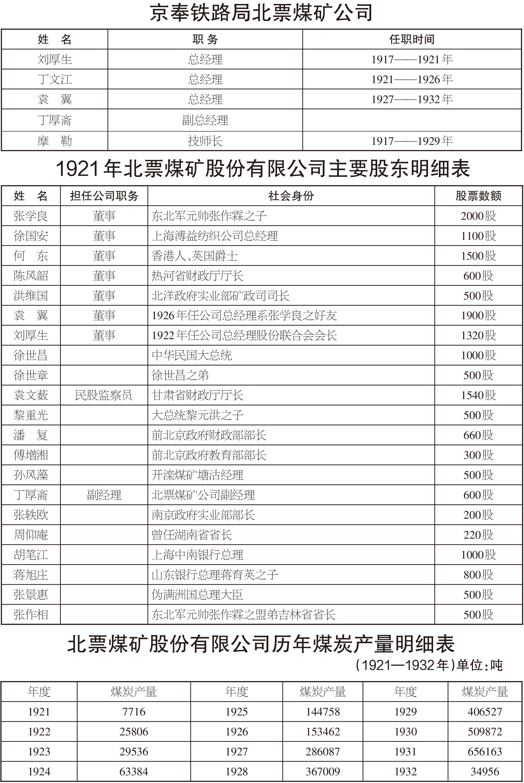 天津意大利租界,北票设驻矿事务所。总资本5万股(500万元),官股为京奉铁路局持2万股,商股大多为国民党军政要员和银行家等,合计为3万股,其中最大股东张学良2000股。聘请丁文江任总经理,刘厚生改任董事长。